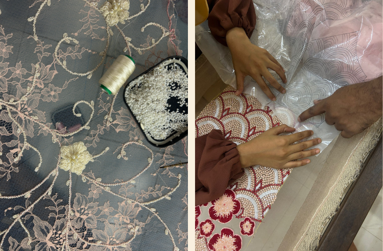 These artisans are not just workers; they are storytellers, weaving emotion and heritage into every fold and motif. From hand embroidery to delicate finishing, their dedication brings unmatched character to every ensemble.
